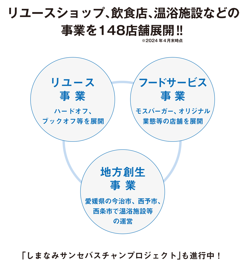 ブックオフなどを運営する「リユース事業」、飲食店などを運営する「フードサービス事業」の2つの事業に加えて、近年は第3の事業として食や観光を切り口に、瀬戸内しまなみ地域を盛り上げる「地方創生事業」にも取り組むなど、積極的な事業展開を行っている。新卒採用では採用面接段階で「リユース事業」「フードサービス事業」「地方創生事業」の中から学生が希望する事業部を選択する。