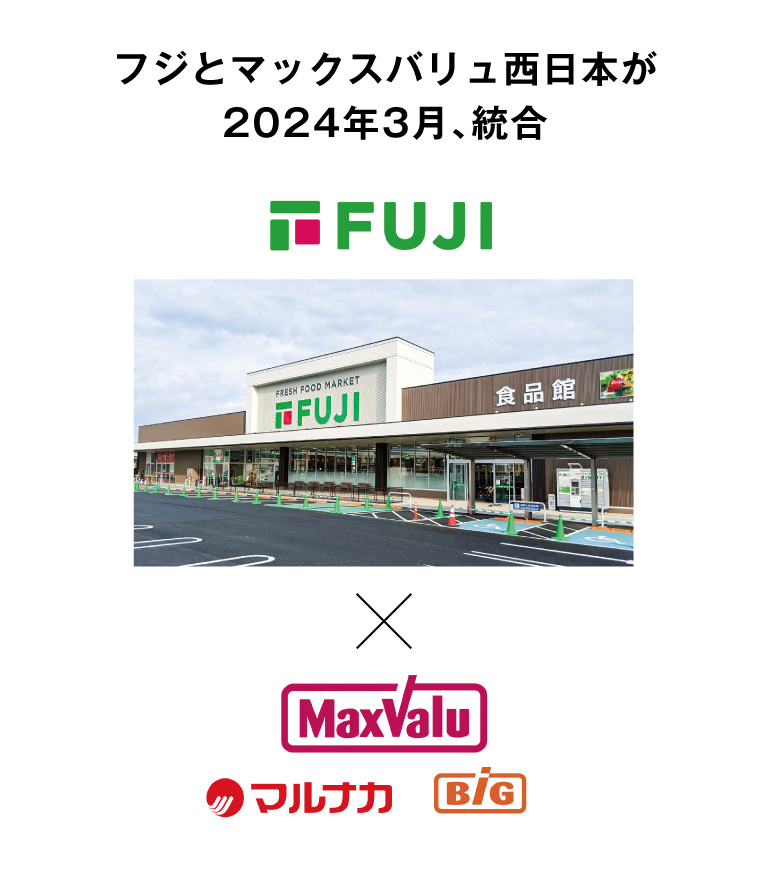 1967年、愛媛県宇和島市に創業したフジ。創業当時から、常に大切にしてきたことは「地域」と「人」と「くらし」。2024年3月、マックスバリュ西日本(株)との経営統合により、中四国・兵庫エリアの人々の「圧倒的な安心とワクワク」を実現し最も地域に貢献する企業集団を目指す。地域の人々に圧倒的に指示される店舗づくりに取り組むとともに、地域の人々の豊かなくらしづくりに貢献していく。