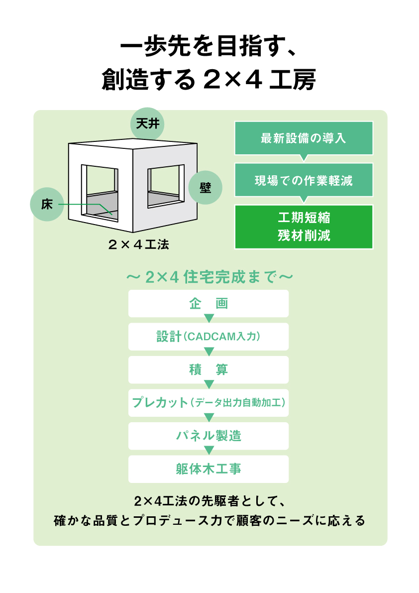 2×4木造住宅の企画から設計、積算、プレカット、躯体木工事に至るまで最新設備を導入し、自社で一貫して手掛ける。業界ではいち早くCADCAM連動機械化、生産ライン化を導入し商品のコストダウンに取り組んでいる。