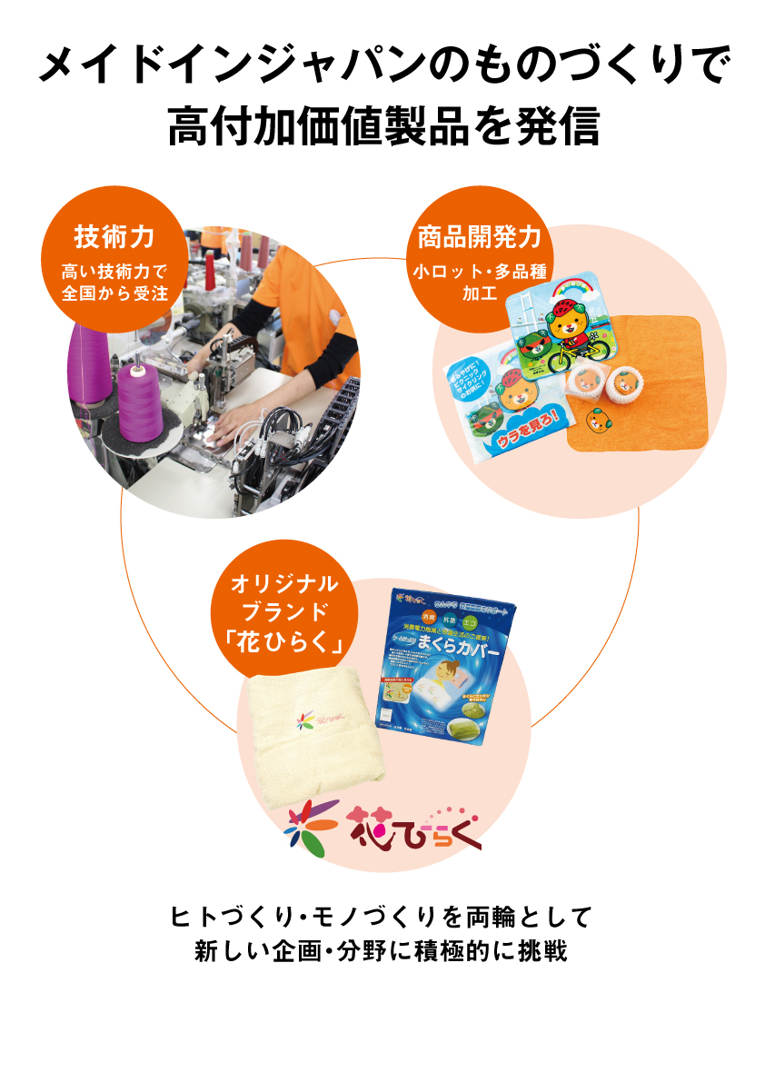 昭和62年に全国有数のタオル産地である今治で創業。タオルから布地全般まで小ロット・多品種の生地加工を手掛ける。高い技術力と高品質なものづくりで全国から依頼を受け、取引先の県外比率は約6割を占める。多機能の飾りミシンを数多く保有し、新しい企画にも積極的に挑戦している。オリジナルブランドの「花ひらく」では臭気成分を吸着する特殊な繊維を使い、消臭機能のあるタオルやアパレル製品等を展開する。