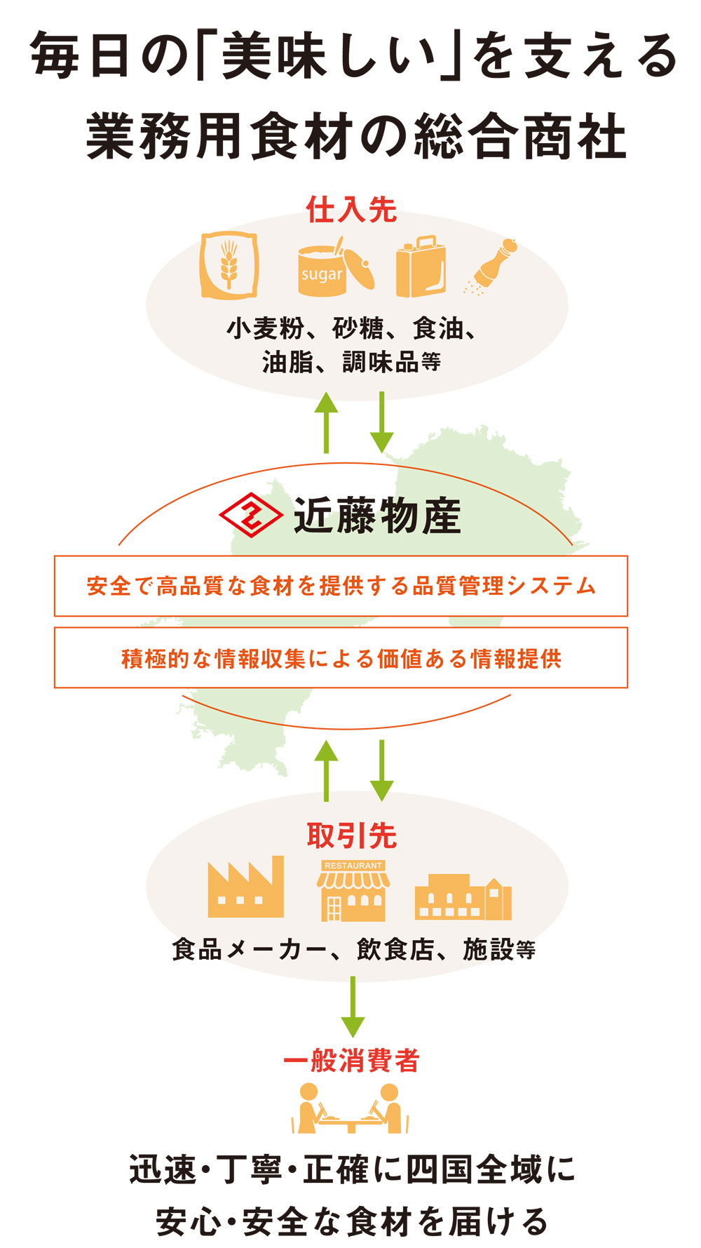 小麦粉・砂糖・油脂・食用油などの業務用食材を取り扱う専門商社。安心・安全で美味しく健康的な「食材」を届けることで、地域の豊かな食文化の発展に貢献している。迅速・丁寧・正確をモットーに四国一円だけでなく、岡山・京都・大阪・静岡・長崎など幅広い地域に1,500社以上の取引先がある。