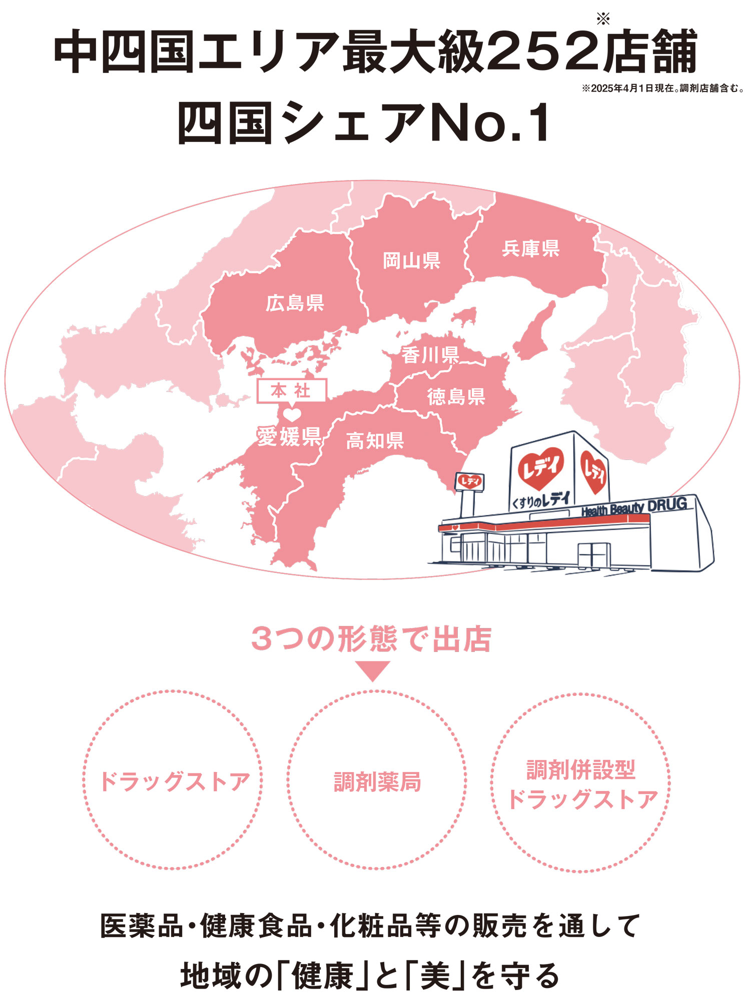 ドラッグストア事業を軸に、店舗数は中四国を中心に252店舗を展開(2025年4月1日時点)。店舗形態も、路面での単独店舗、調剤薬局を併設している調剤併設店舗、スーパーを核とした商業施設での併設店舗などお客様の生活シーンに合わせた店舗を展開している。