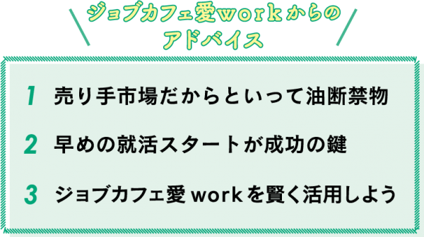 最近の傾向として、近年の売り手市場で危機感が薄れているせいか、解禁直前になってからゆっくり就活をスタートする人が増えています。愛workへ来られるのも3月頃に集中しています。皆さん一斉に利用しようとするため、相談やセミナーに入れないこともあります。ぜひ早めに就活をスタートしていただければと思っています。