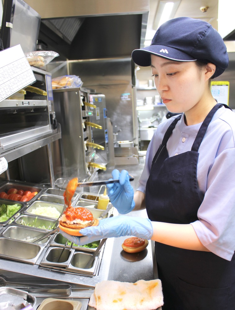 店では接客でホールを担当しながら、徐々に調理を経験していきます。モスバーガーでは時間帯によって担当する業務はある程度決められていますが、手が回らないところがあるとヘルプに回ったり両方の業務をすることもあります。