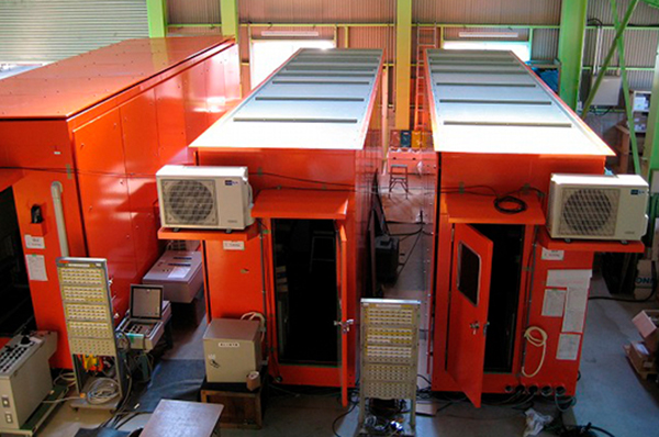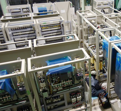 特に組み立てでは、まず、ボタンやスイッチ計器、コントローラー、表示器などの電気部品を筐体内部の所定の場所に取り付ける。高電圧機器も多いため、安全性とメンテナンス性を考慮し作成された設計図に従いしっかりと固定していく。