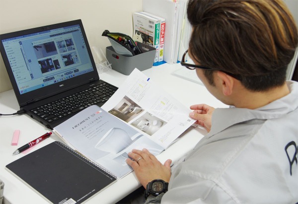 問い合わせの対応から工事完成まで関わるのが当社のリフォーム営業です。基本的な流れは、まずお客様の家に訪問して状況を確認します。その後、工事に必要な商品を選定し、実際に工事を行う協力業者に見積もりを依頼した上でお客様に提示する見積書・契約書を作ります。工事中はスムーズに工事が進むように、進捗具合の確認や細かい打ち合わせを随時行います。