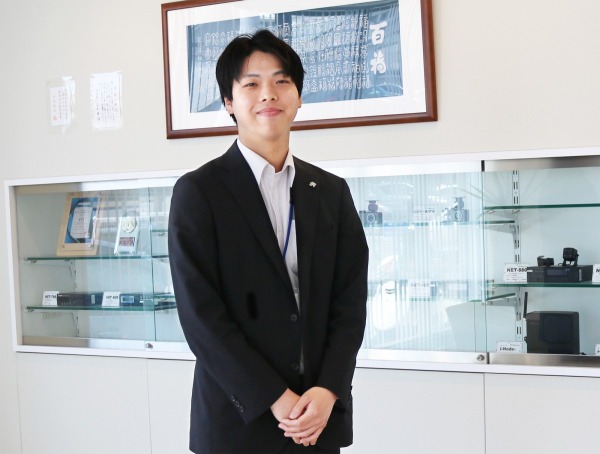 運輸業向け製品の営業を担当している先輩にインタビュー。会社の支援で購入した本で業界について学んだり、資格を取得するなど勉強熱心な先輩です。